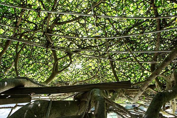 一到達劍門生態花果園休閒農場,會看到一個高高的棚架,上頭的爬滿了爬藤植物,當天氣溫高達28度,在這個棚架下卻異常涼爽,是天然的空調。
