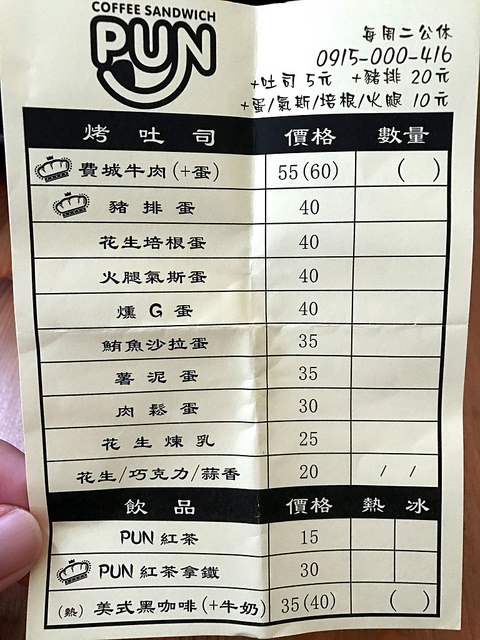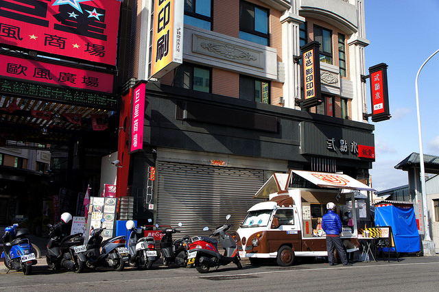 ▲第一家要介紹的是"PUN餐車",地點位於沙鹿區北勢東路的弎點水飯堂門前,遠遠就能看到一部敞開歐翼門版的棕色小胖卡,還有眼睛,十分可愛。