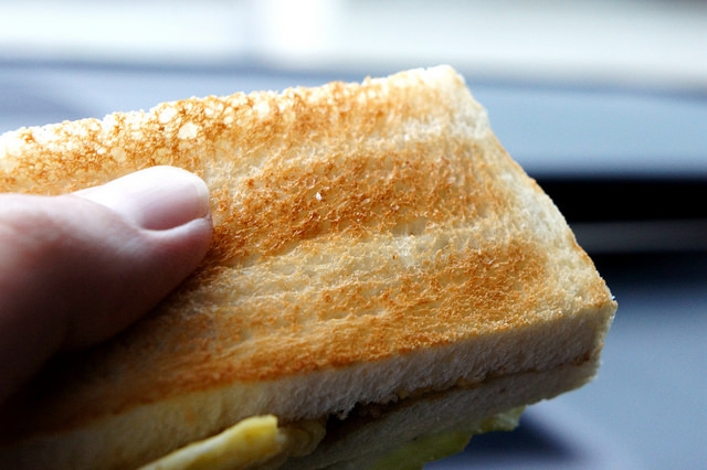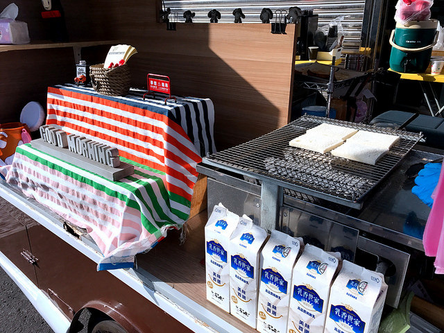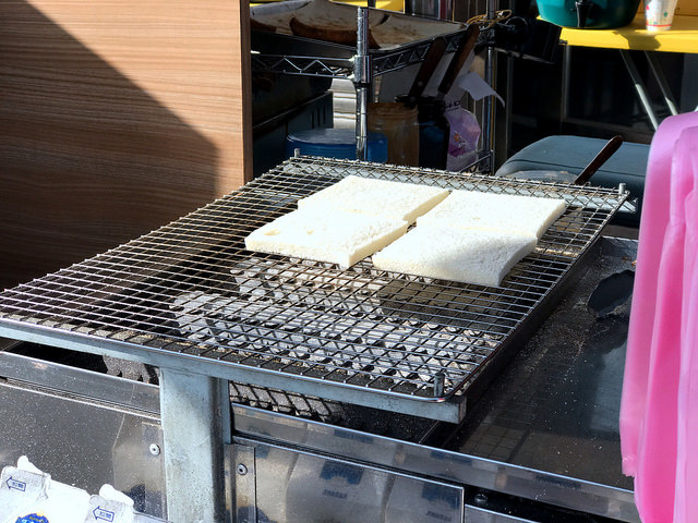 ▲告胖的吐司是用碳烤的,在現場可以看到老闆快速翻面的烤吐司過程,烤到金黃色的吐司酥香紮實,也多一股手作風味。