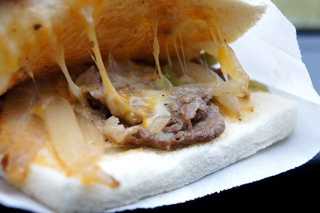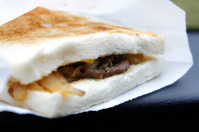 ▲打開那雪白又帶著烤盤烙印的吐司,裡面包著的其實就是道道地地的料理,青椒洋蔥炒牛肉再豪邁的鋪上香濃起司。