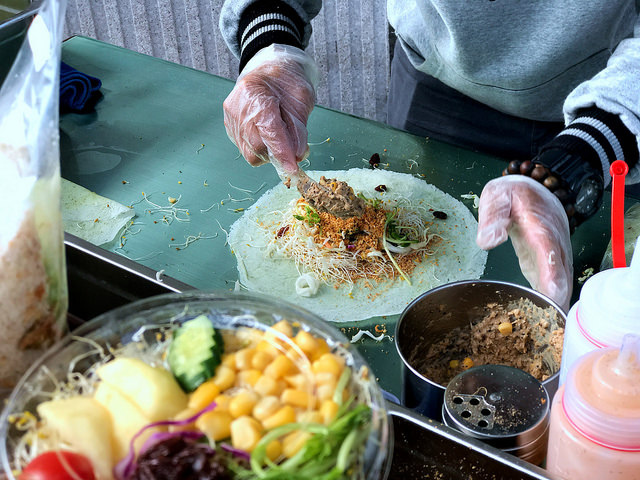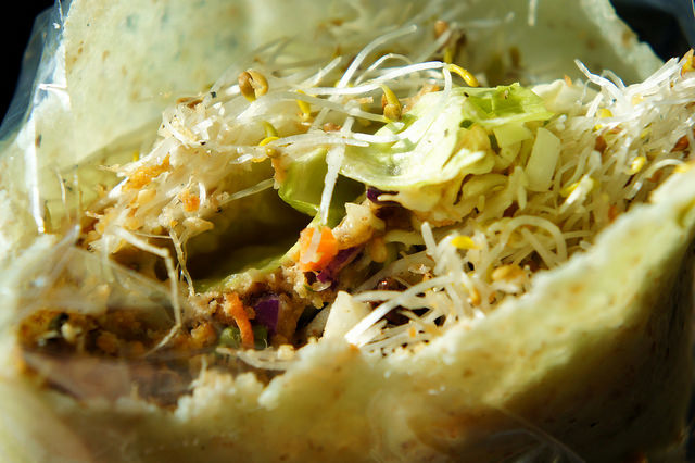疊上新鮮的生菜,灑下大量有粗細顆粒的花生粉,再挖一大匙鮪魚放在最上頭,形成一個尖聳的蔬食塔,最後再把餅皮捲起來,大功告成。